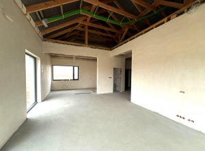 Pierwsza część domu według projektu, to salon z jadalnią i aneksem kuchennym, łazienka, spiżarnia i taras.