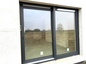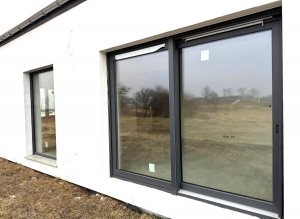 Okna trzyszybowe antywłamaniowe z czujnikami alarmu oraz roletami. Drzwi antywłamaniowe.