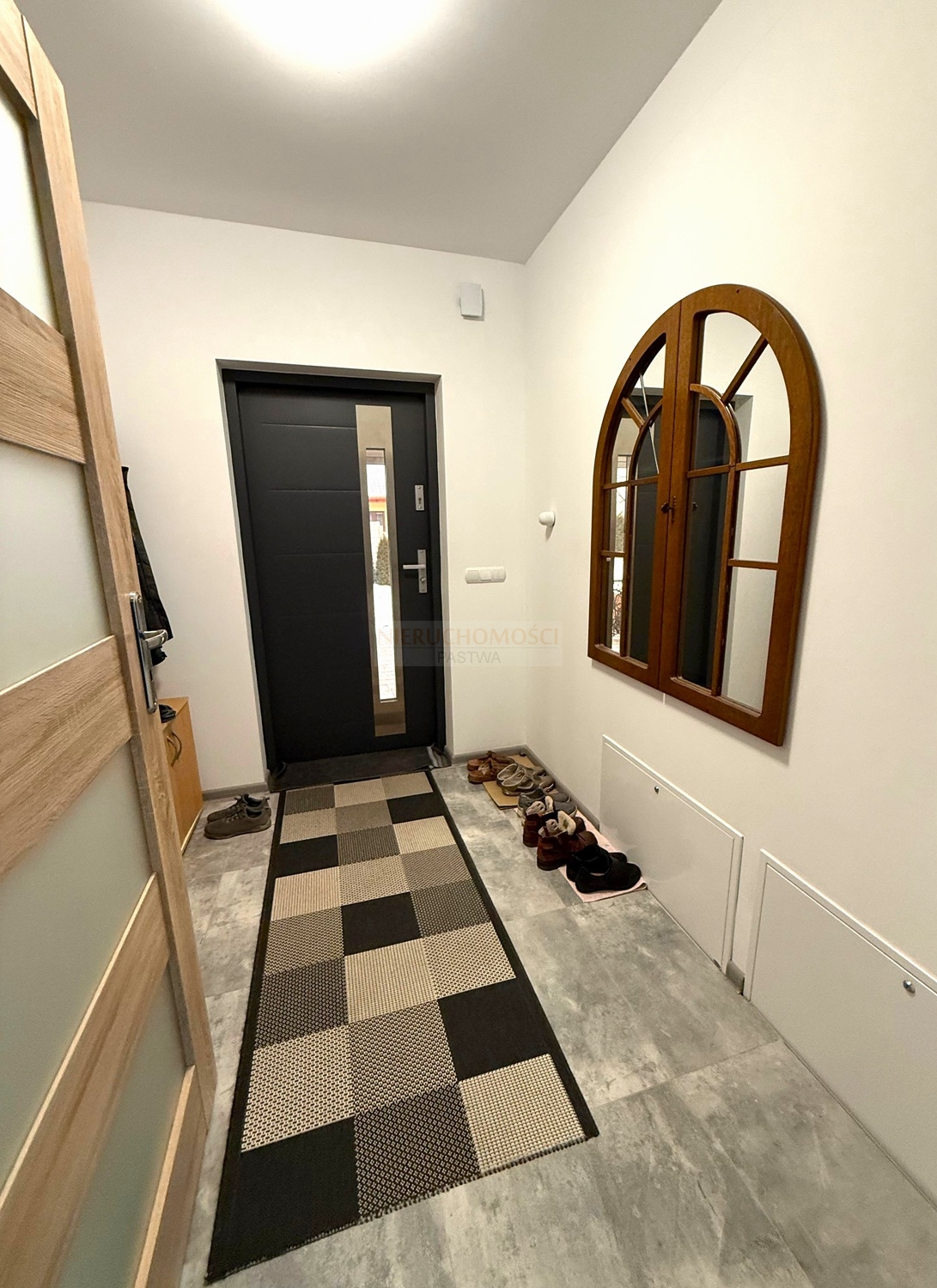 Okna PCV trzyszybowe z roletami elektrycznymi.Budynek ocieplony styropianem grubości 20cm. Na ścianach pomieszczeń tynki cementowo-wapienne, gipsowe oraz płytki. Na podłogach panele i kafle.