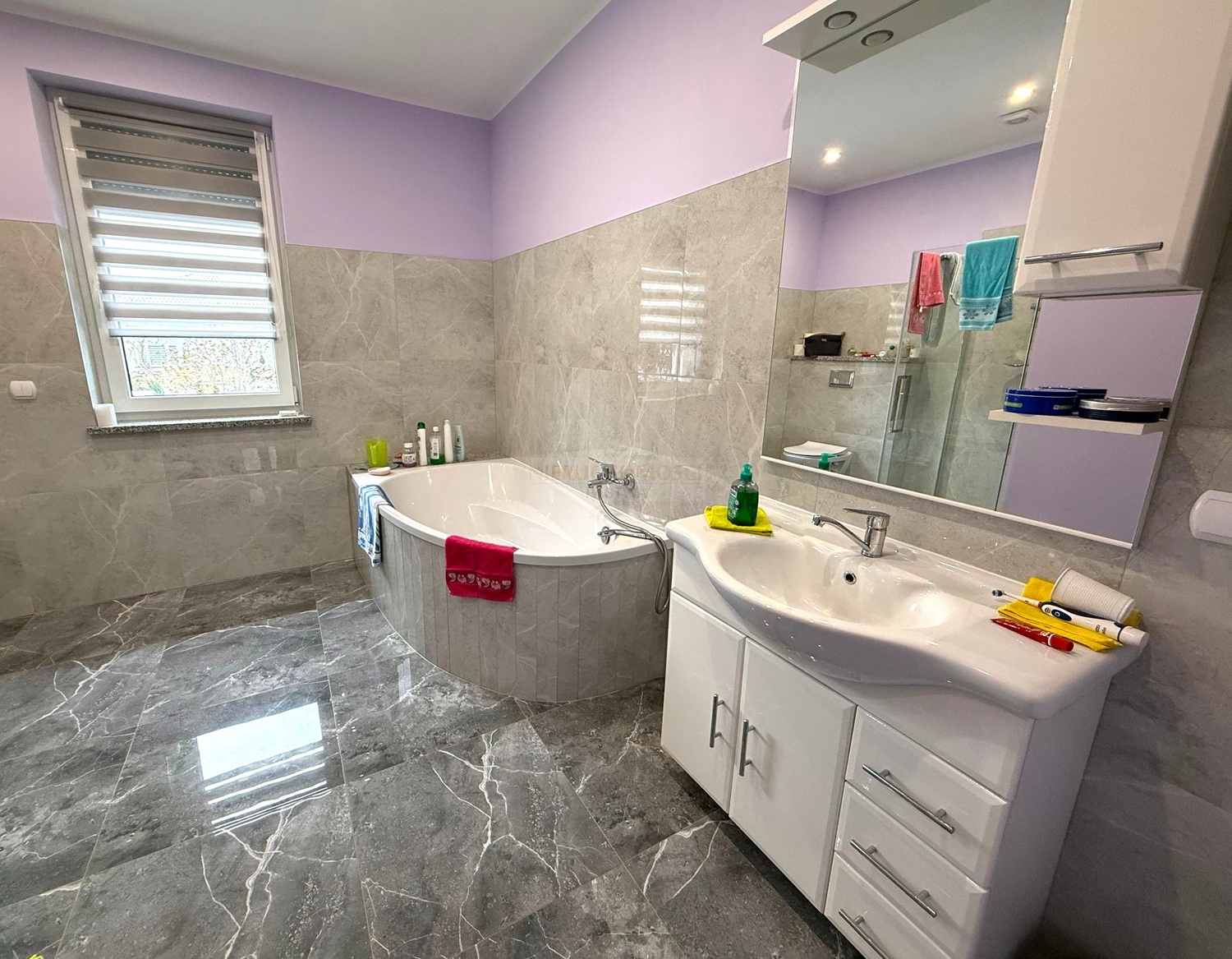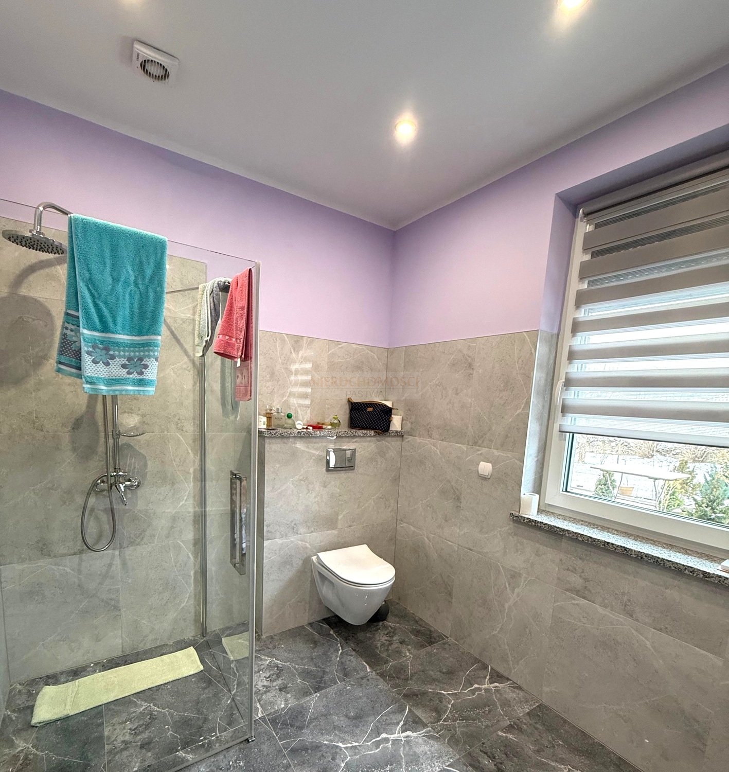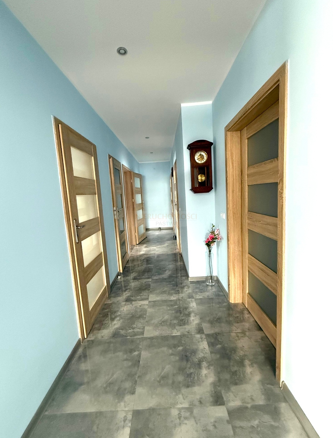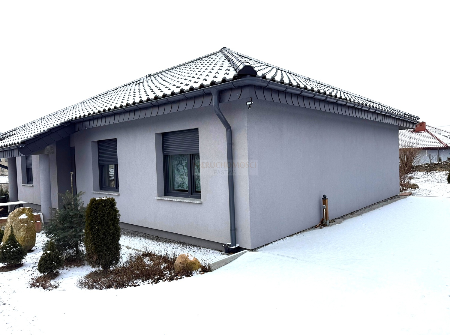 Okna PCV trzyszybowe z roletami elektrycznymi.Budynek ocieplony styropianem grubości 20cm. Na ścianach pomieszczeń tynki cementowo-wapienne, gipsowe oraz płytki. Na podłogach panele i kafle.